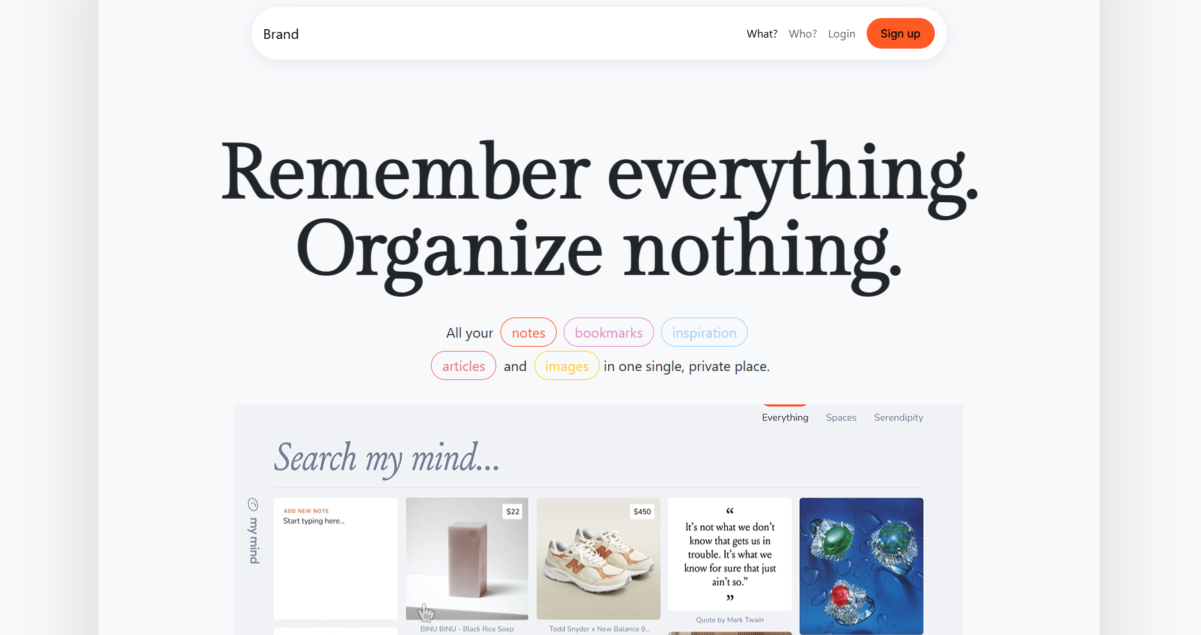 This is a beautifully minimalist tool for saving and organizing your ideas, images, articles, and notes—all in a private, clutter-free space. With smart tagging and instant search, it works like a second brain. No folders, no likes, no followers—just your mind, quietly organized in one place, effortlessly.